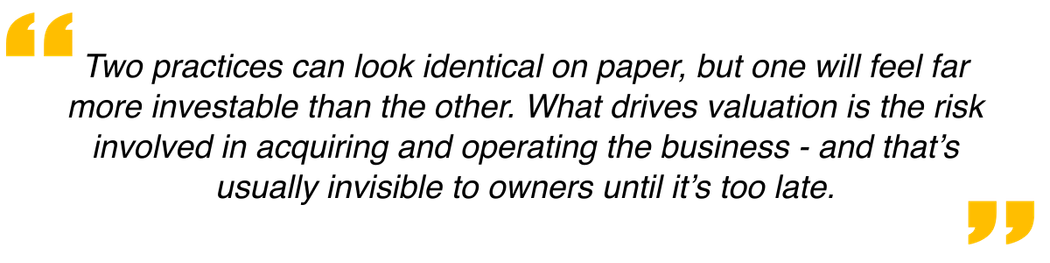 From a buyer’s perspective, valuation is driven less by what a practice earned last year and more by how confidently it can perform in the future. The key question is not how big the business is, but how risky it feels to operate once ownership changes.